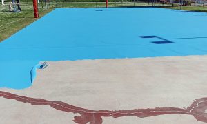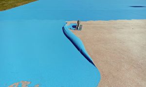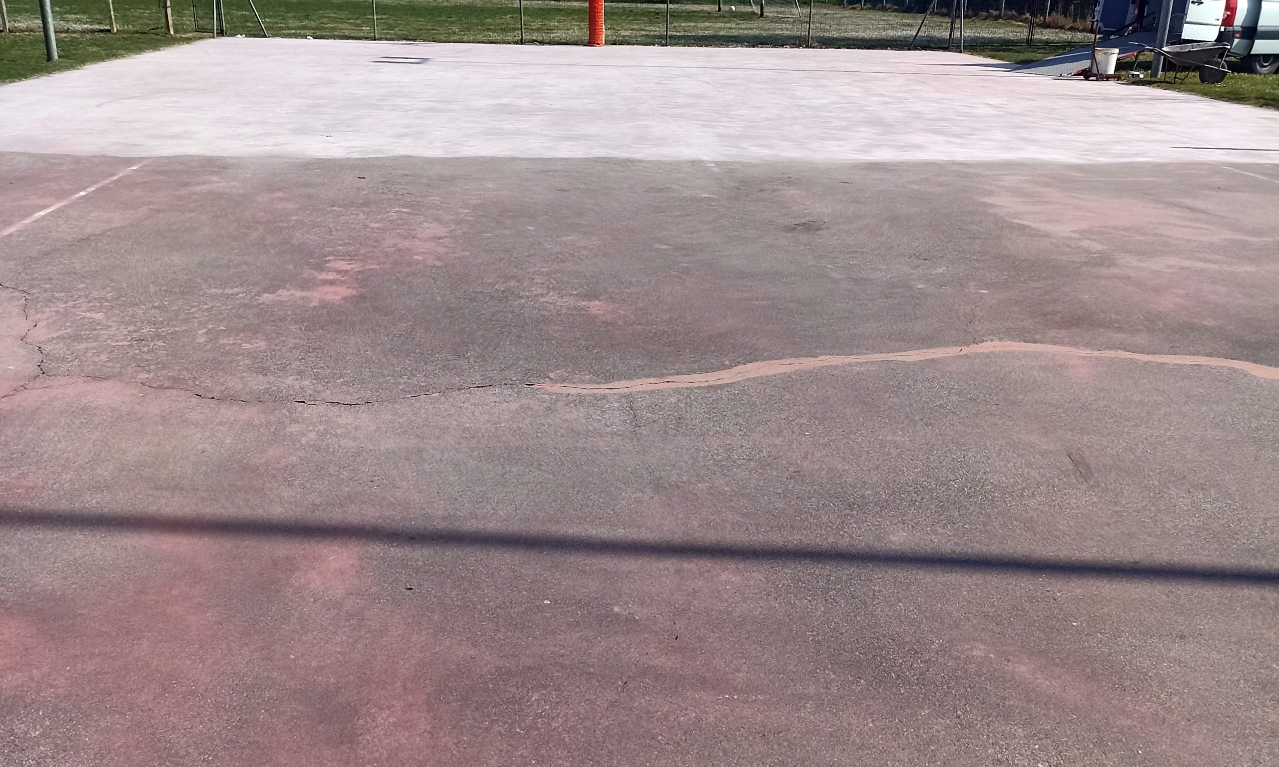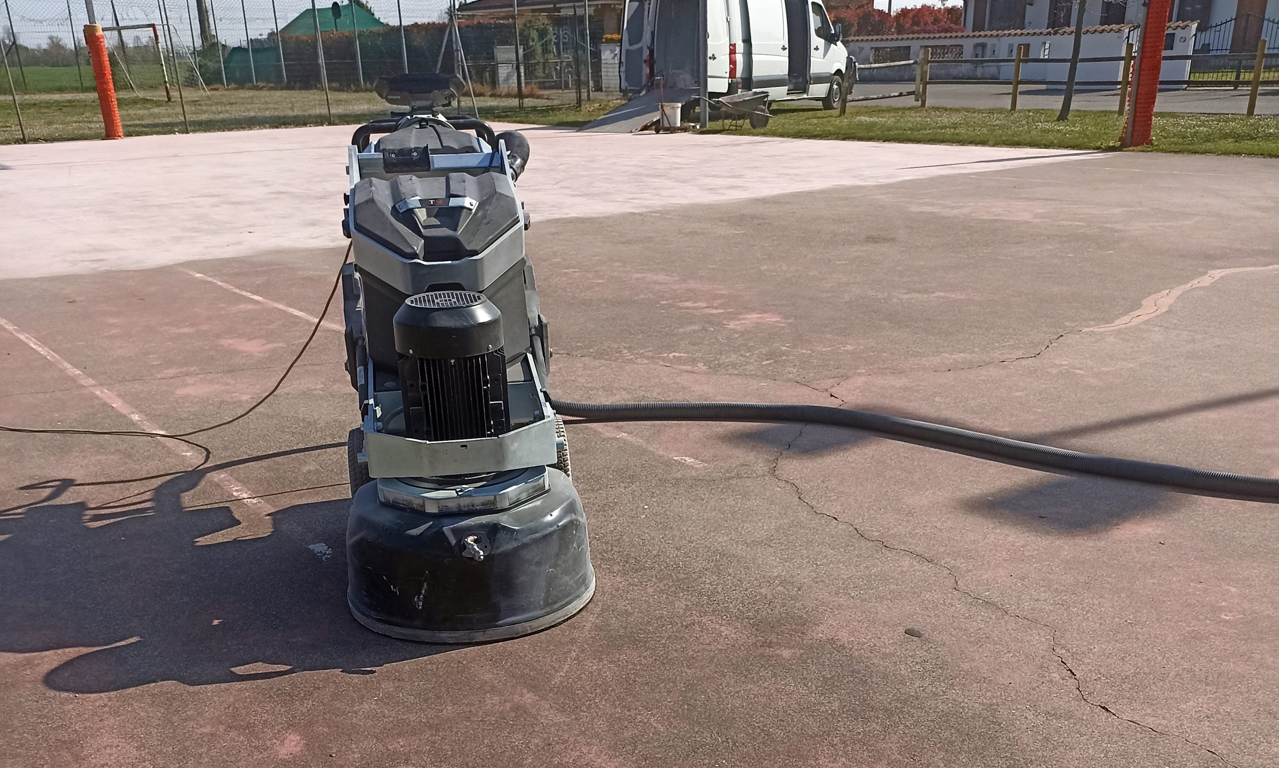 La lavorazione prevede la molatura meccanica a secco della superficie in calcestruzzo con utensili diamantati, successivamente si procede all’apertura delle crepe esistenti ed alla loro stuccatura con resina uretanica bicomponente ad alta penetrazione.